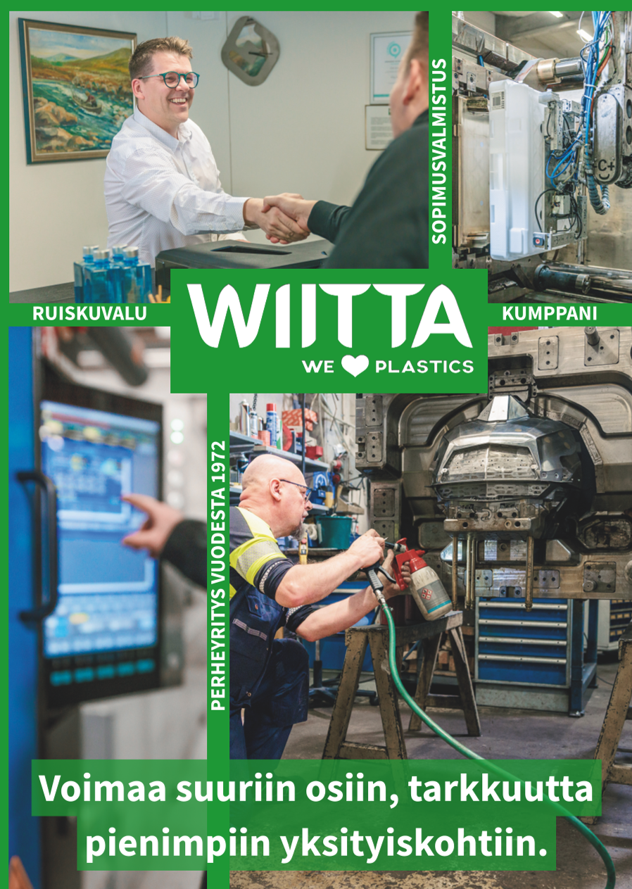 Teknisten muovituotteiden sopimusvalmistaja Wiitta Oy tuottaa asiakaskohtaisia ratkaisuja ruiskuvalutekniikalla (ruiskupuristus). Monipuolinen ja runsas konekantamme mahdollistaa tuotteet kokoluokissa 0-6.500 grammaa aina yksittäiskappaleista miljooniin. Tehtaamme pyörii sertifioidulla vihreällä sähköllä.