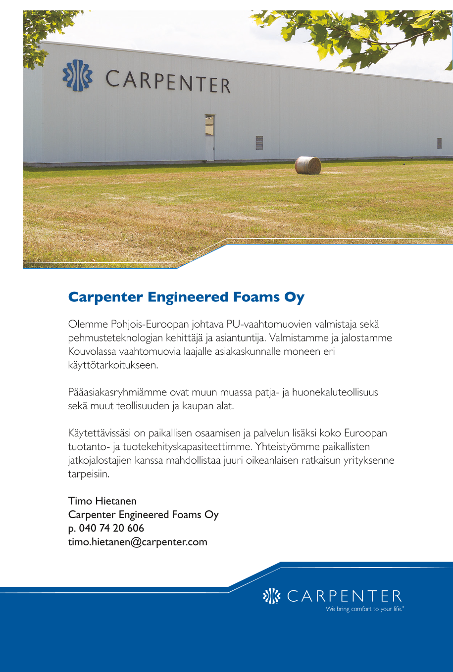 Carpenter on perheyhtiö, joka on maailman suurin polyuretaanivaahtomuovien valmistaja. Carpenter osti Recticel Engineered Foamsin liiketoiminnan kesällä 2023. Konsernillamme on yli 70 tehdasta ja 6500 työntekijää ympäri maailmaa. Pääkonttorimme sijaitsee Richmondissa, Yhdysvalloissa.