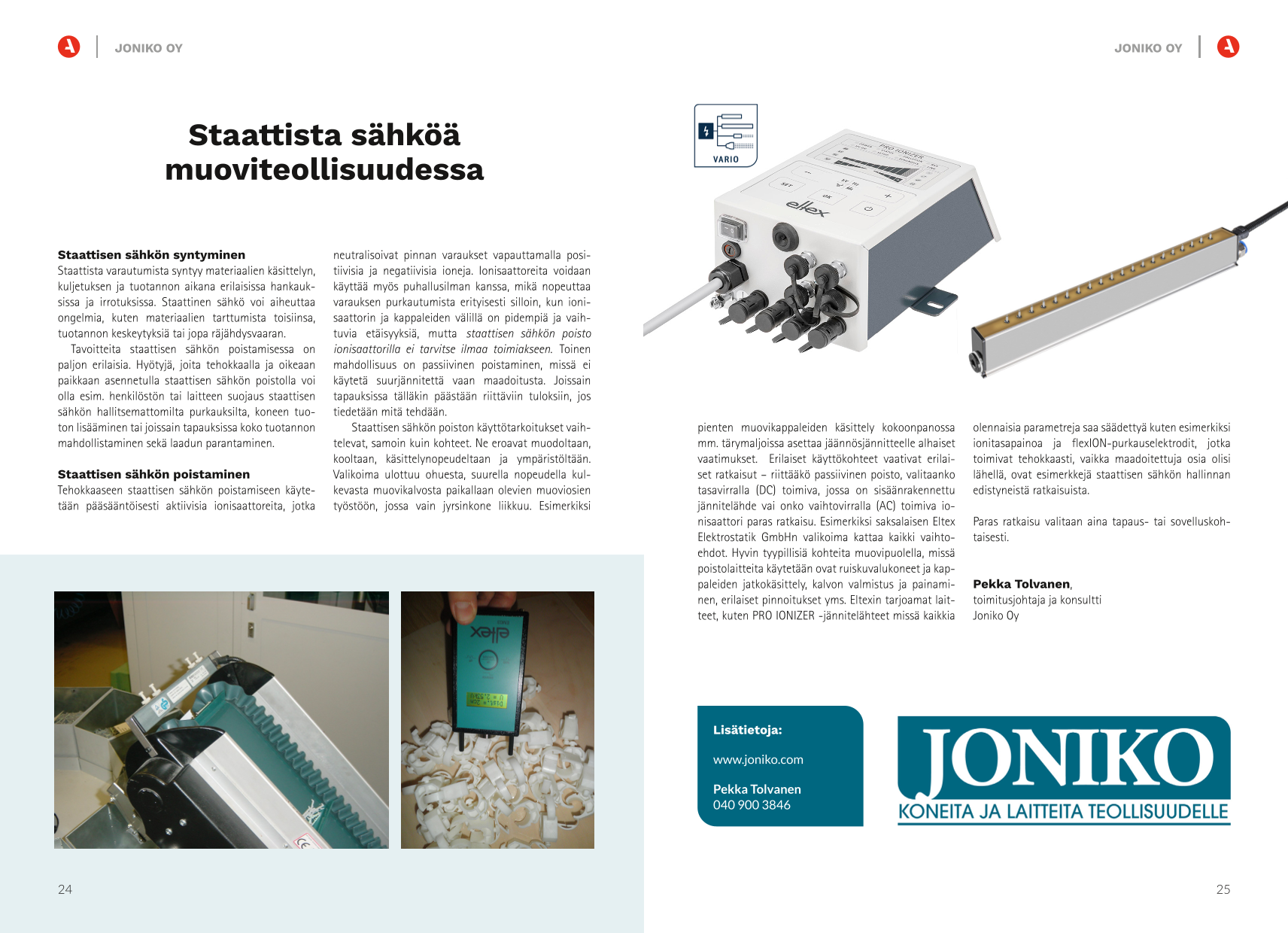 Joniko Oy on kokenut teollisuuden kone- ja laitetoimittaja. Maahantuomme ja myymme Eltex -staattisen sähkön poisto- ja varaavia laitteita sekä turvamaadoituslaitteita, Lundberg Tech -reunanauhan- ja stanssausjätteen poistojärjestelmiä sekä silppureita/granulaattoreita, Easy Mover -siirtolaitteita, Schwing -lämpöpuhdistuslaitteita, Kelva -rainanpuhdistuslaitteita. Tarjoamme kaikkiin edustamiimme laitteisiin tarvittavat asennukset, huolto- ja varaosapalvelut sekä käyttökoulutuksen.