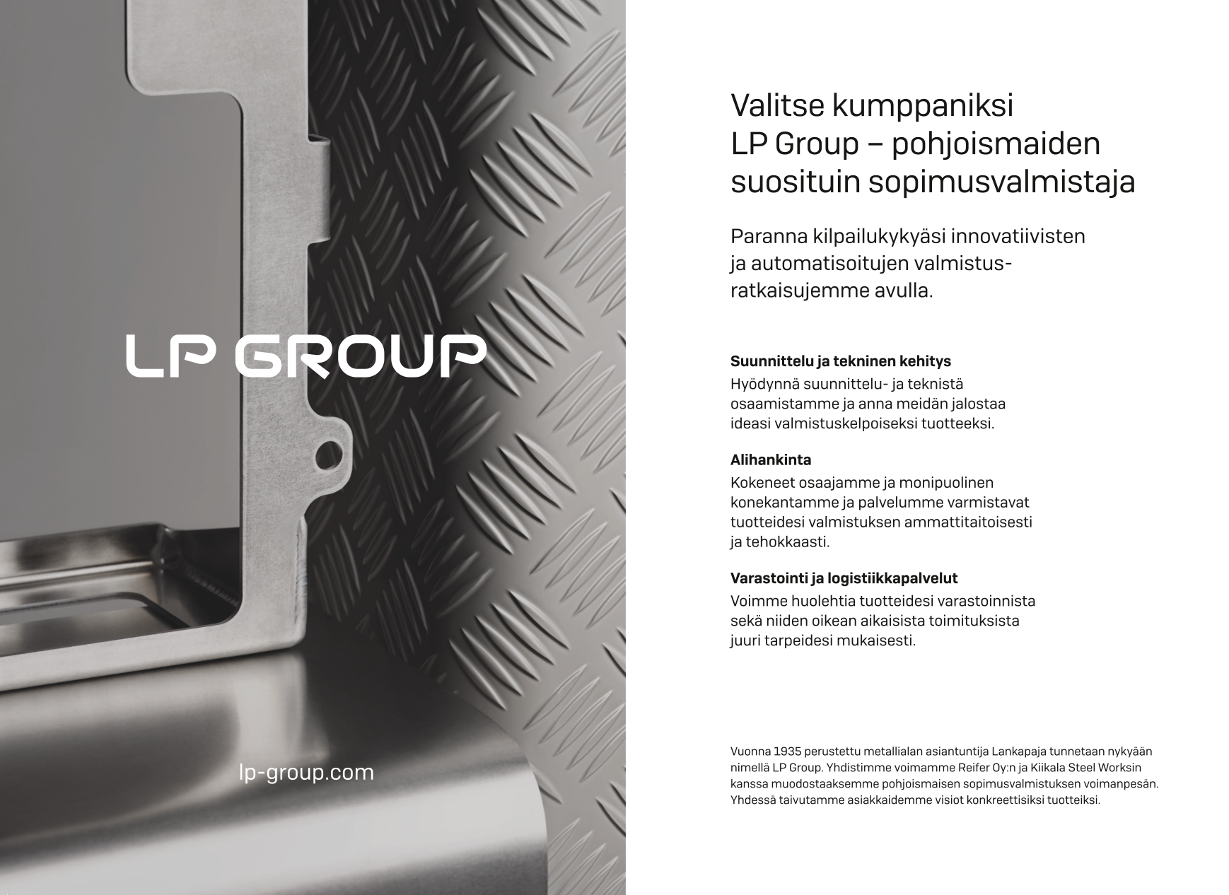 LP Group's (previous Lankapaja, Reifer, Kiikala Steel Works) ambition is to be the best partner for machine builders. We offer all work steps under one roof - sheet metal work, pipe products, wire parts, welding, machining and various surface treatment options with assemblies. Our factories are located in five locations.