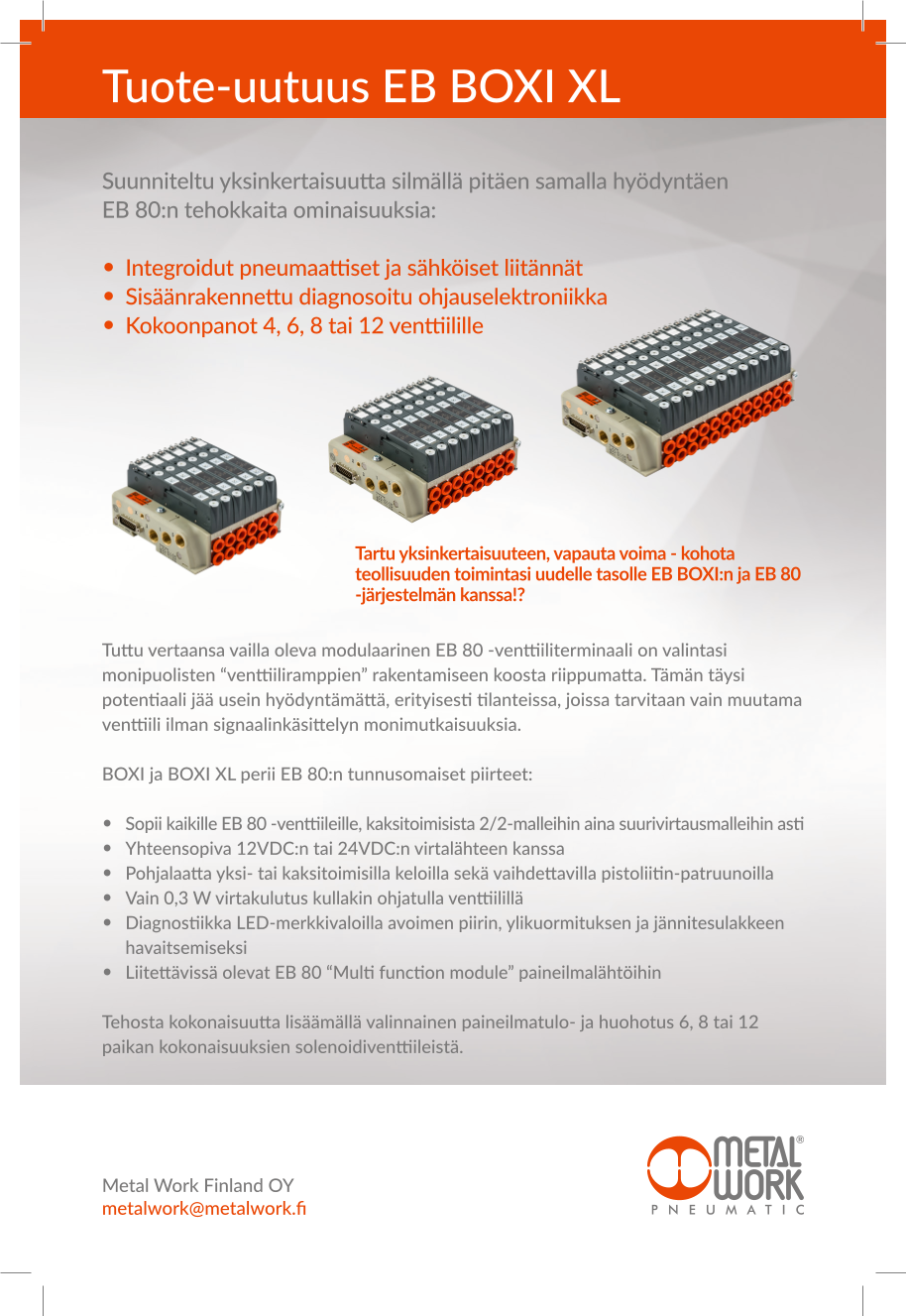 Metal Work on maailmanlaajuinen automaatioalan osaaja, joka on erikoistunut valmistamaan pneumatiikkatuotteita sekä pneumatiikka-kokonaisuuksia.